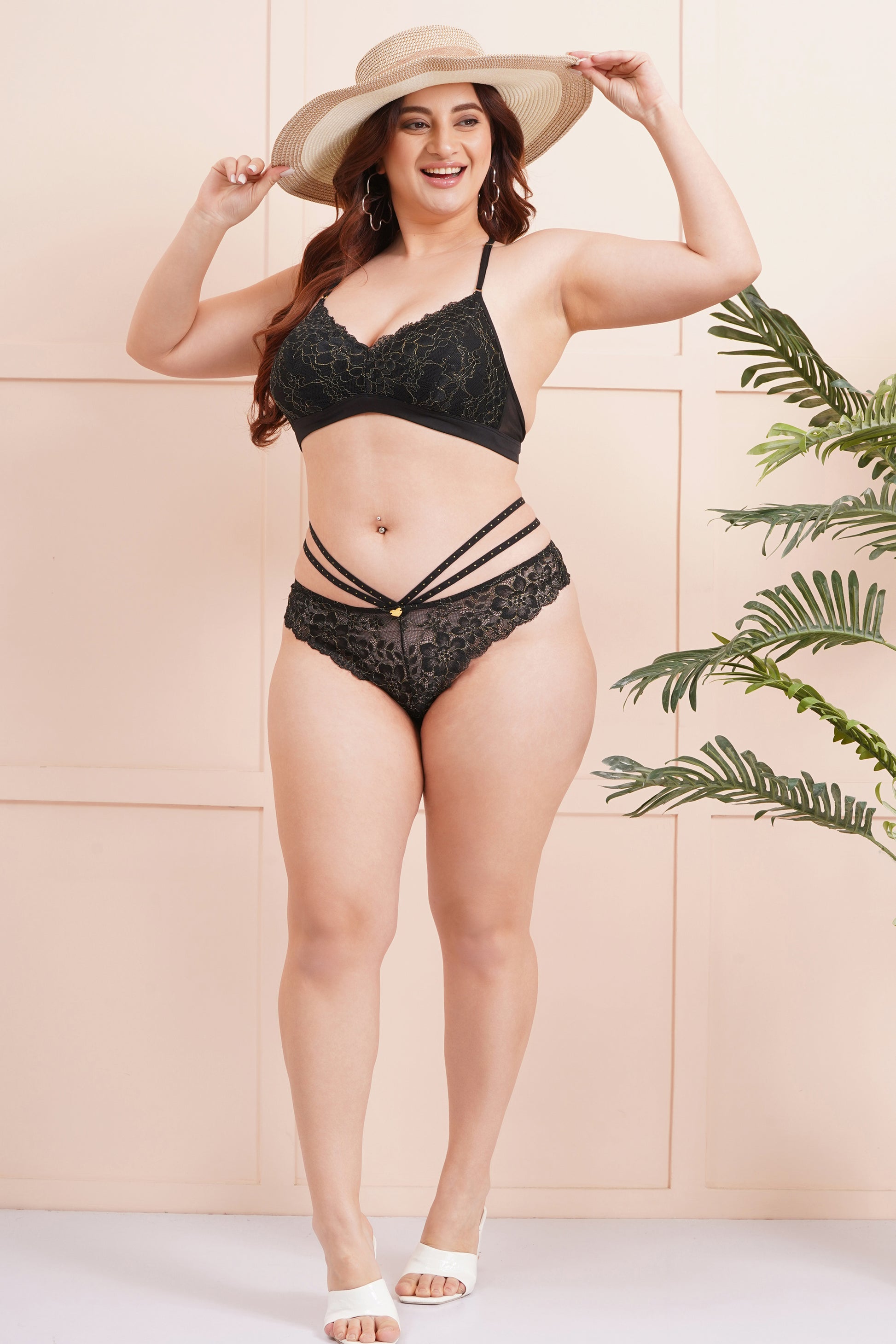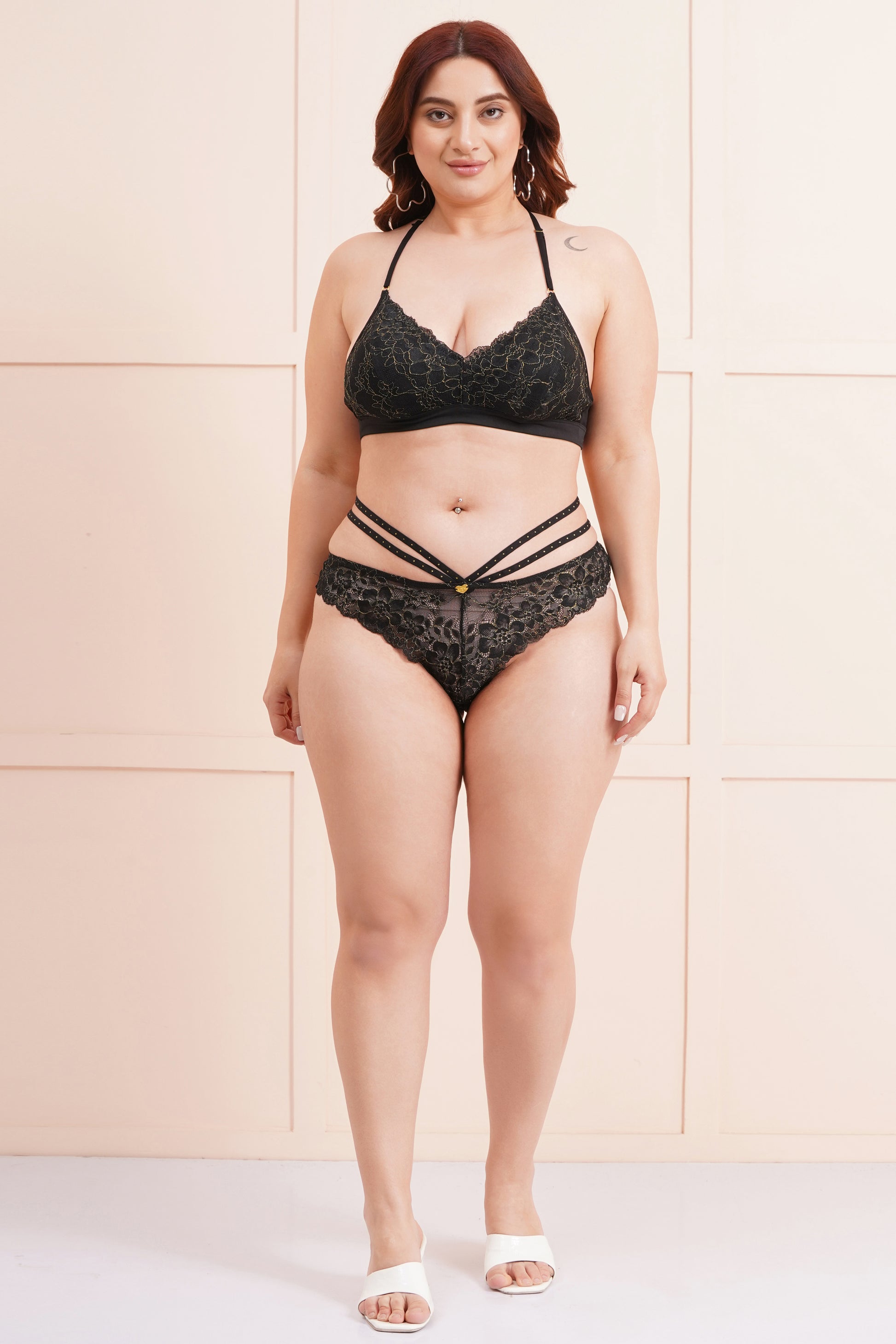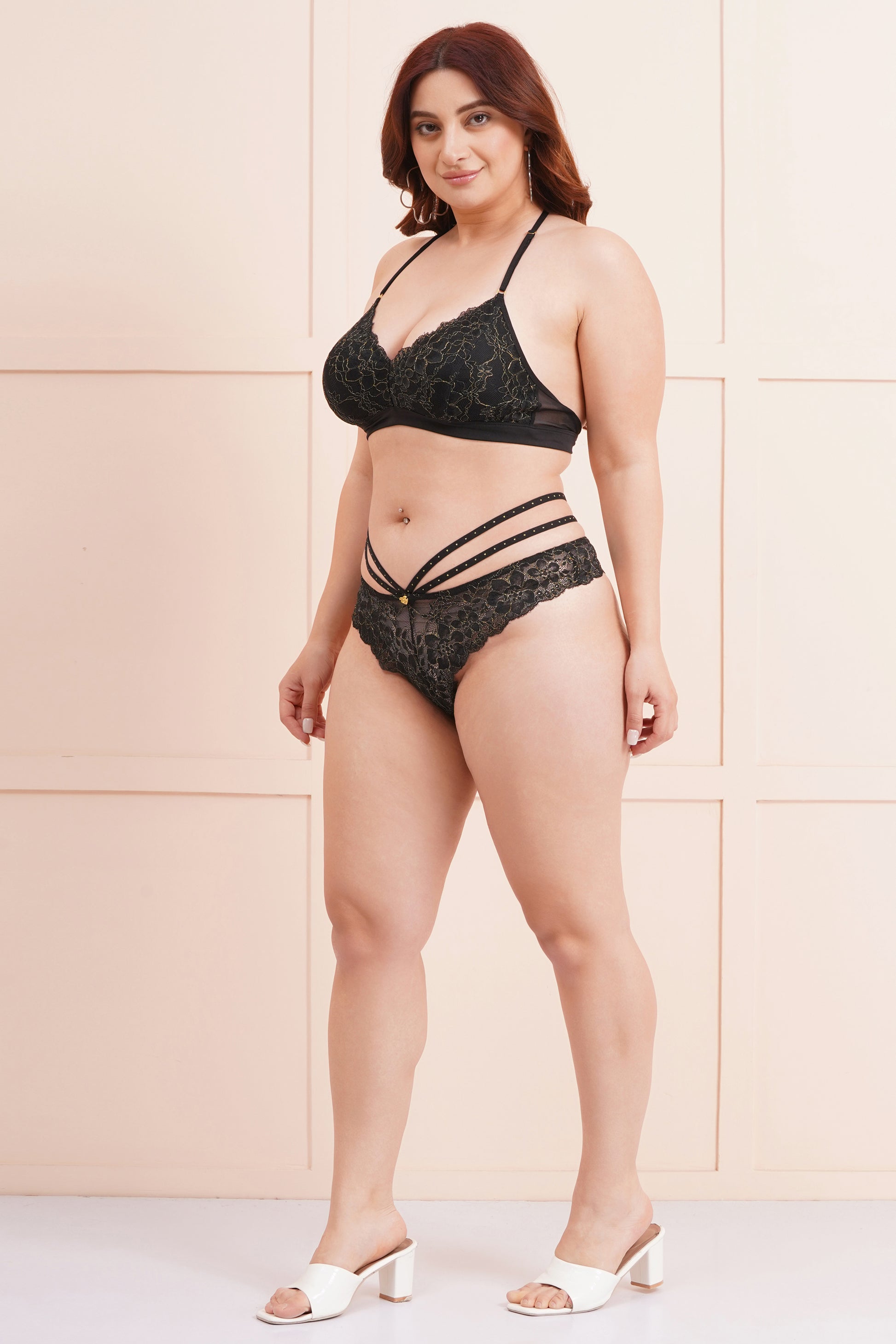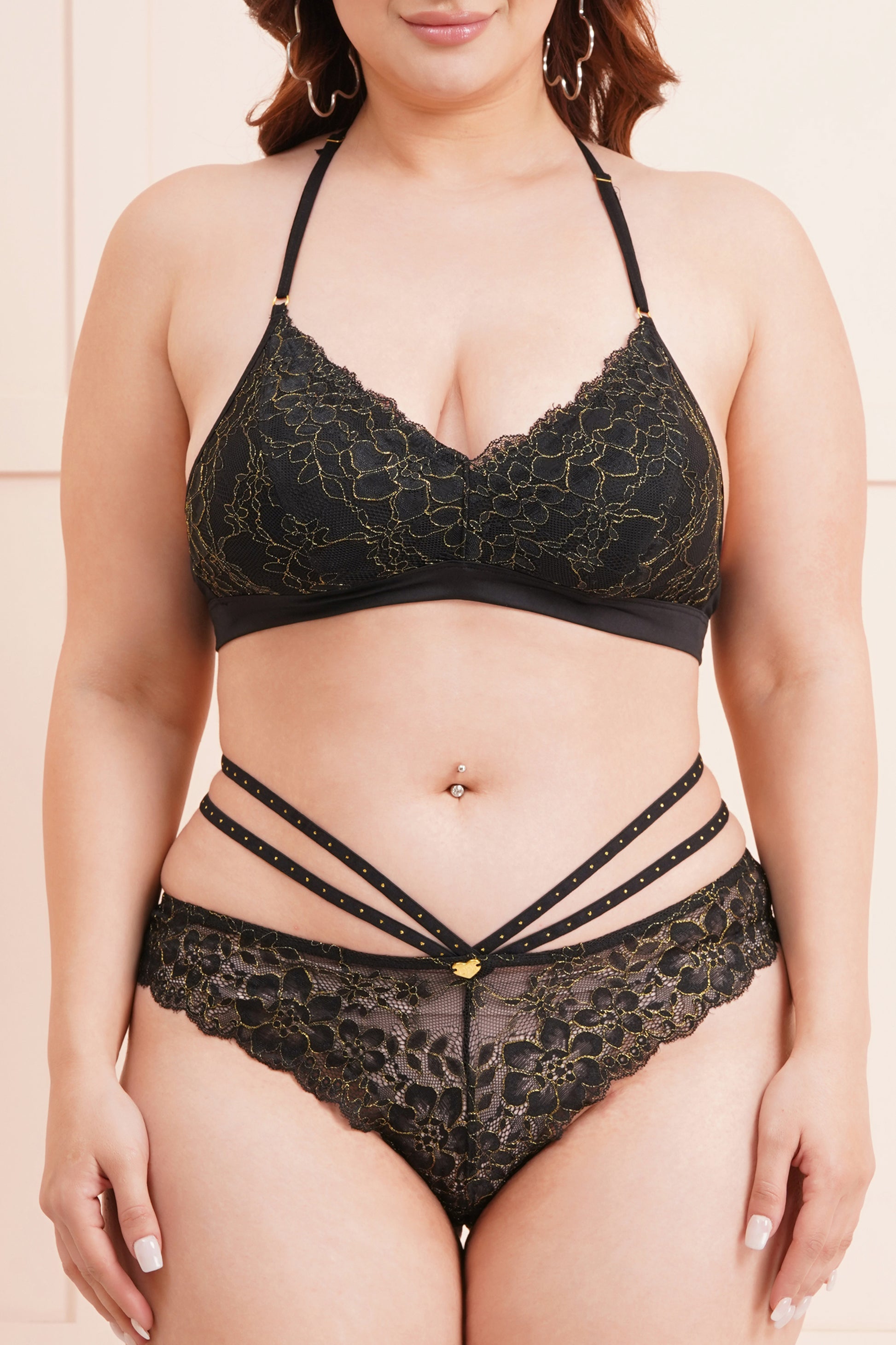 A captivating blend of luxurious black lace with shimmering lurex threads and sexy straps.