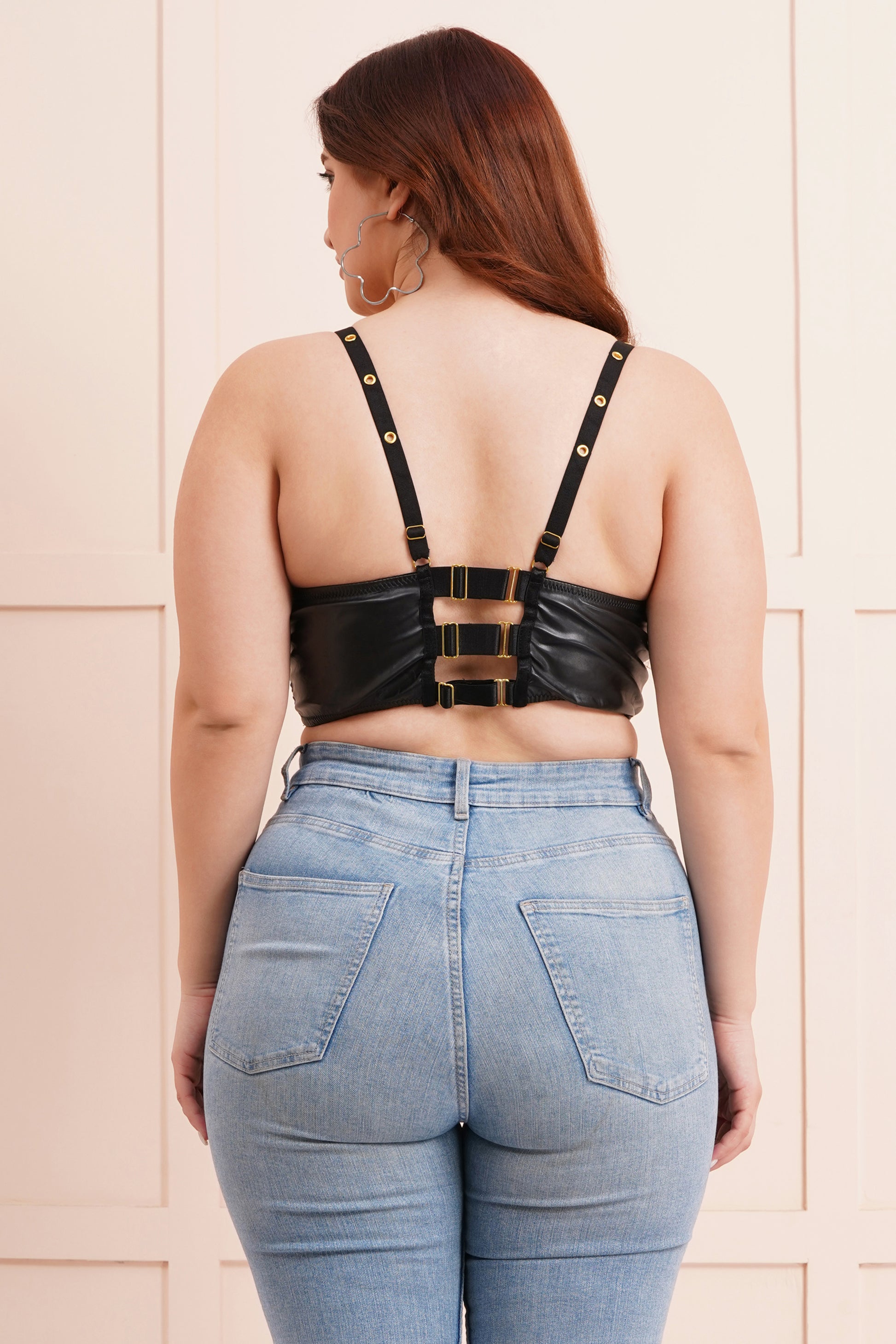 Embrace your inner diva with ENIGMA, a captivating underwired and padded black faux leather corset bra with riveted straps.