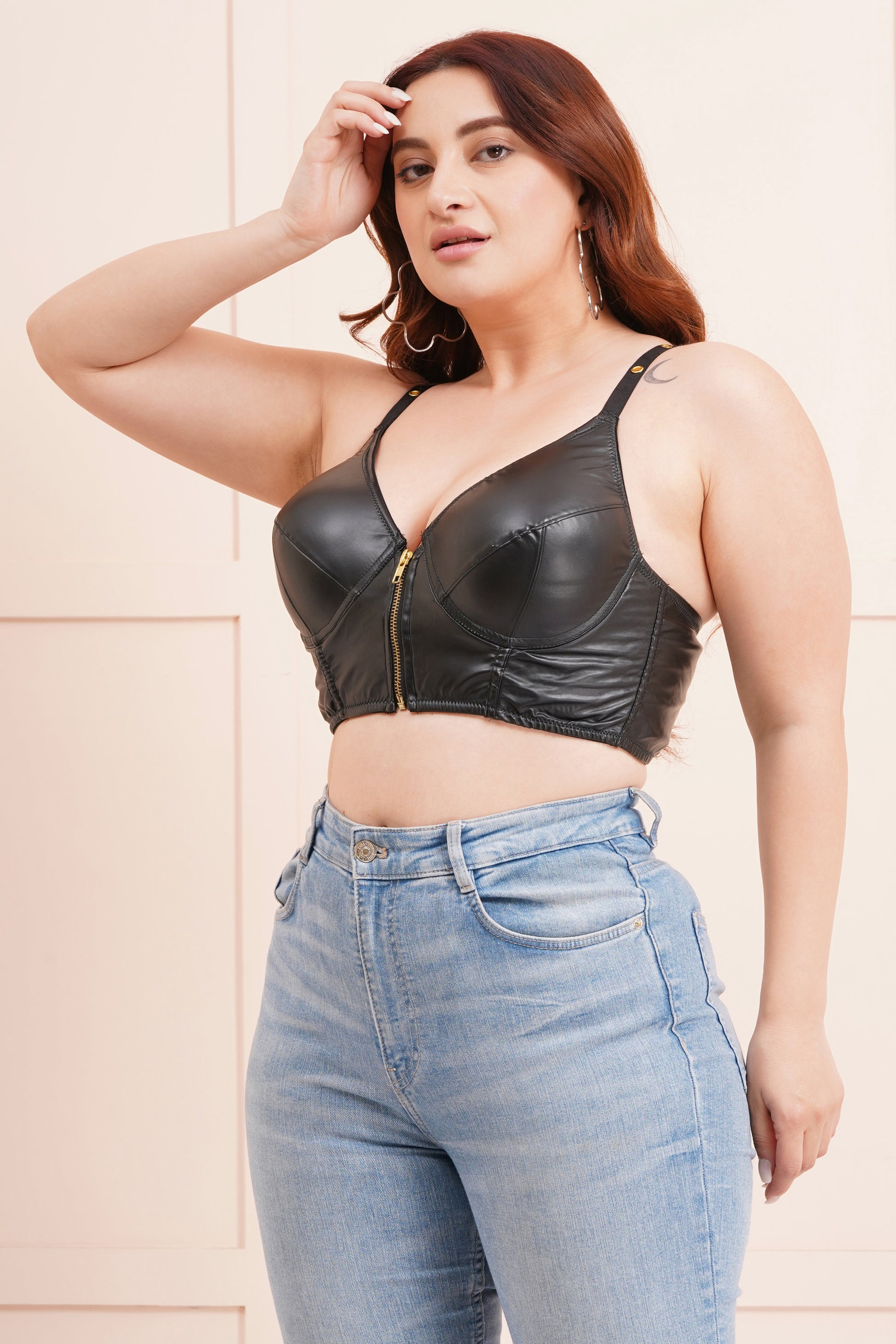 Embrace your inner diva with Enigma: a captivating underwired and padded black faux leather corset bra with a brass zipper.