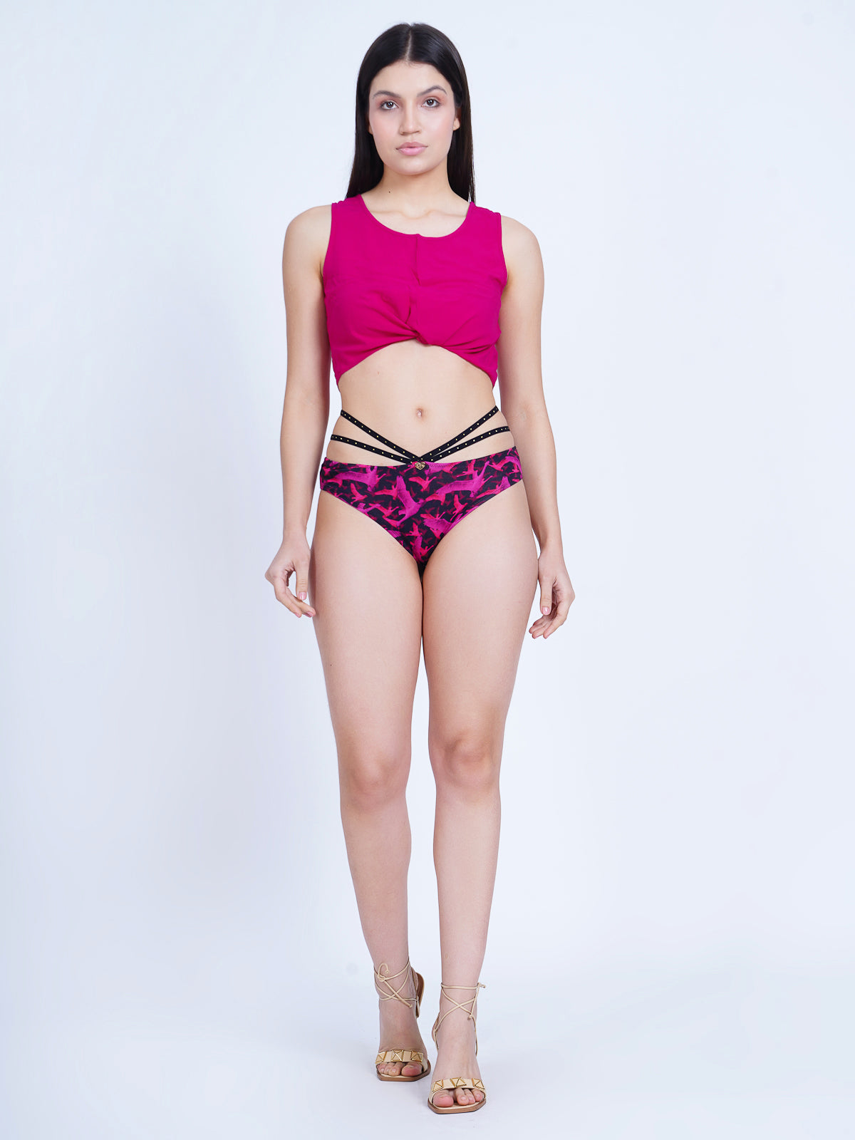 A touch of magic and enchantment, a harmonious blend of an exotic print and accentuating straps.