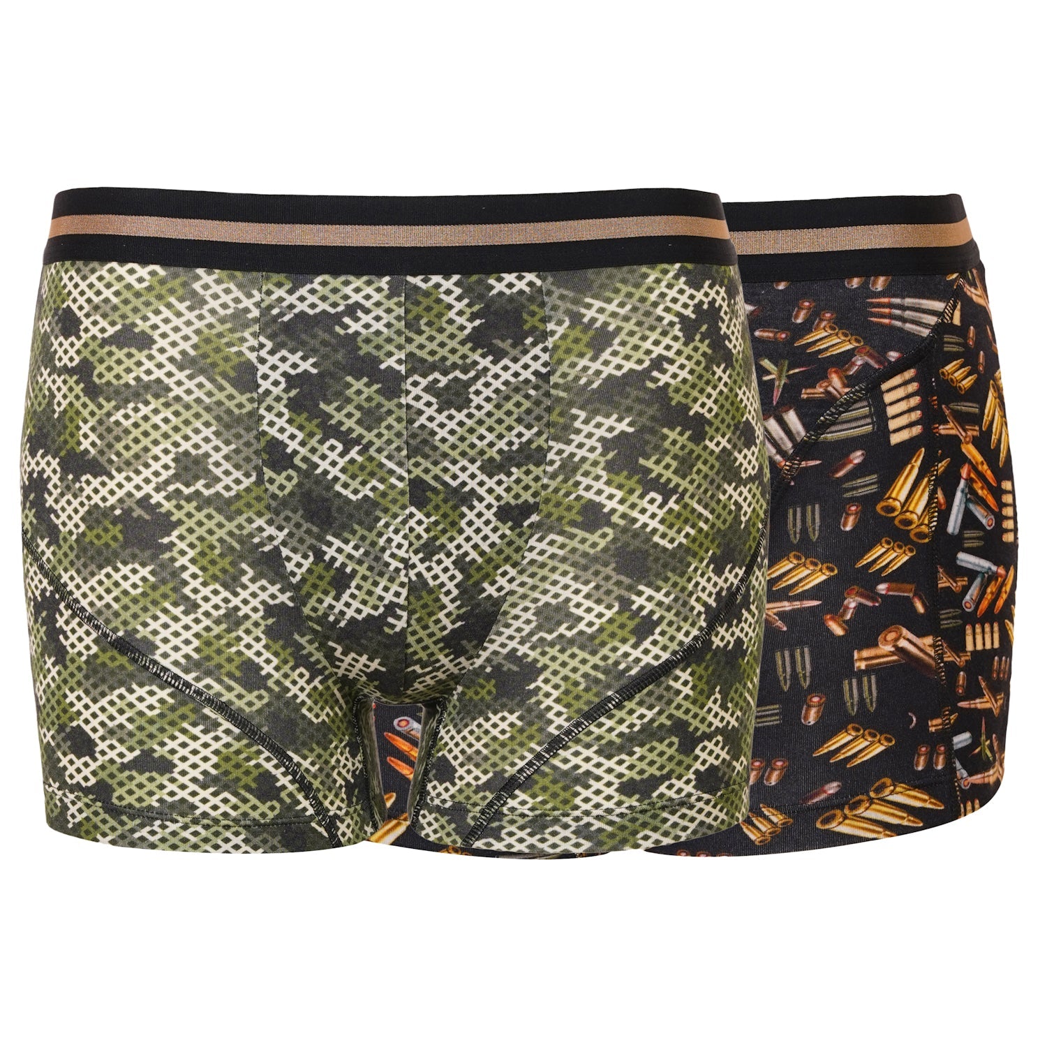 Strike the perfect balance between stealth and boldness with this printed Modal Trunks combo – Predator and Firepower. Crafted from ultra-soft, breathable Micro Modal fabric, Predator features a camouflage print that channels raw instinct and quiet confidence, while Firepower lights things up with a bold bullet-print design that radiates fearless energy. Whether you're embracing the shadows or blazing your own trail, this combo delivers standout style and all-day comfort with a daring edge.