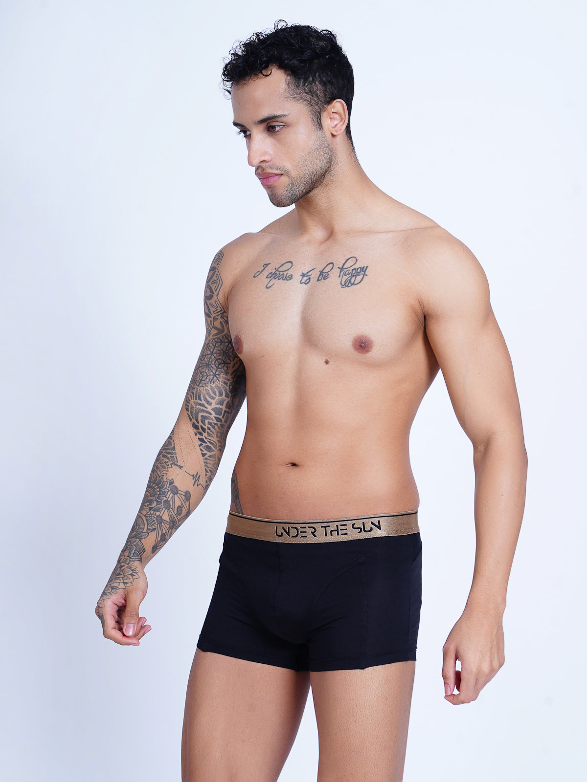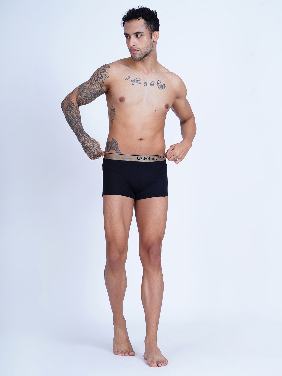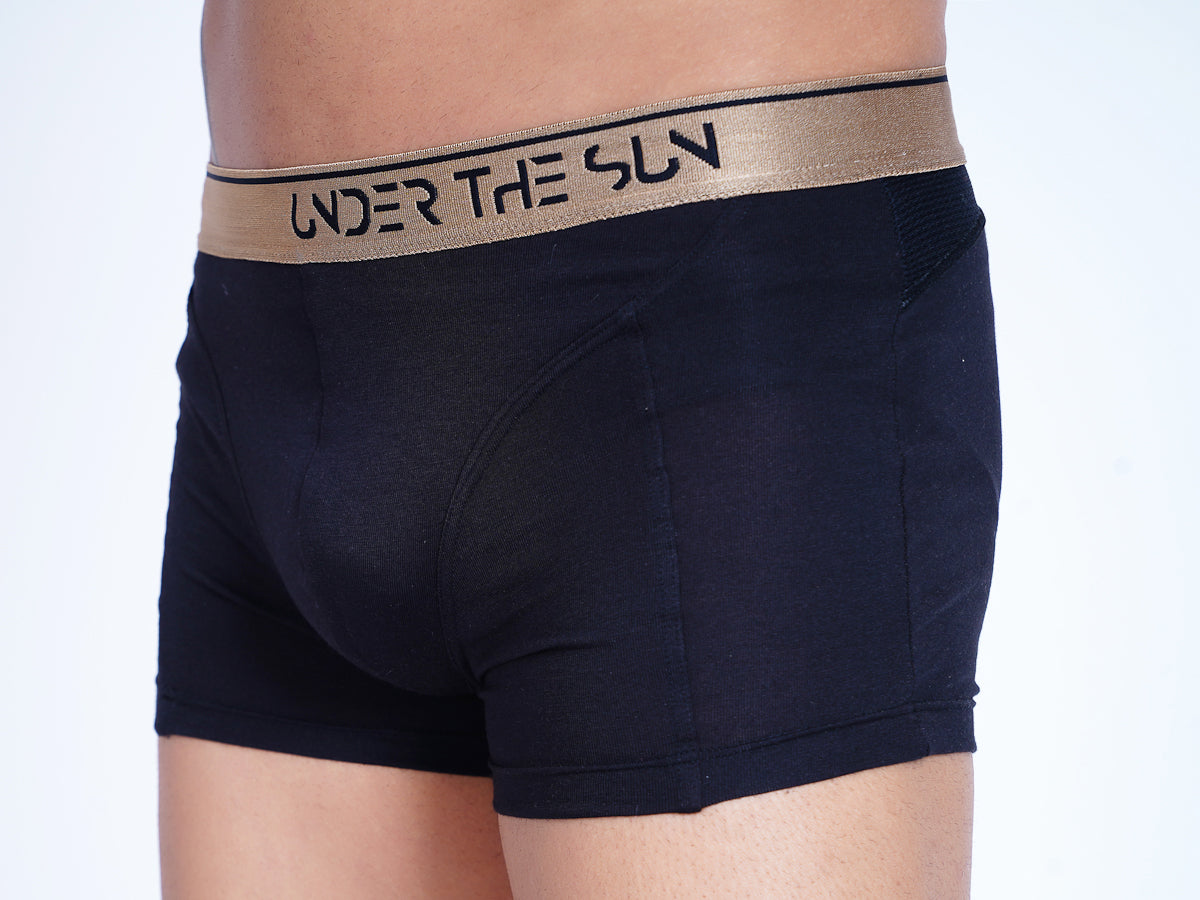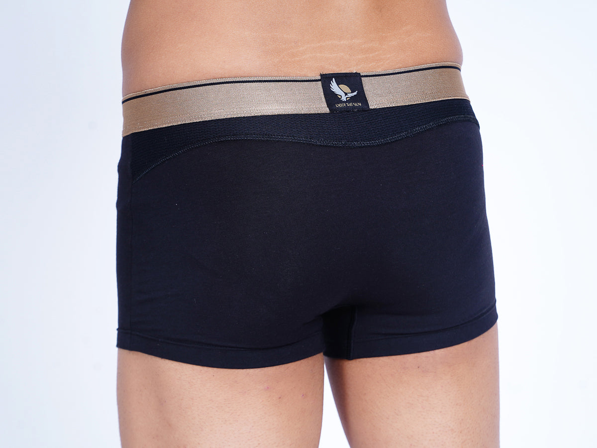 Lightweight and Breathable: Noir Gold feels like nothing at all. The micro modal fabric is incredibly lightweight, allowing your skin to breathe freely, while the stylish polyester mesh back panel adds an extra layer of breathability, perfect for hot days or high-energy activities.