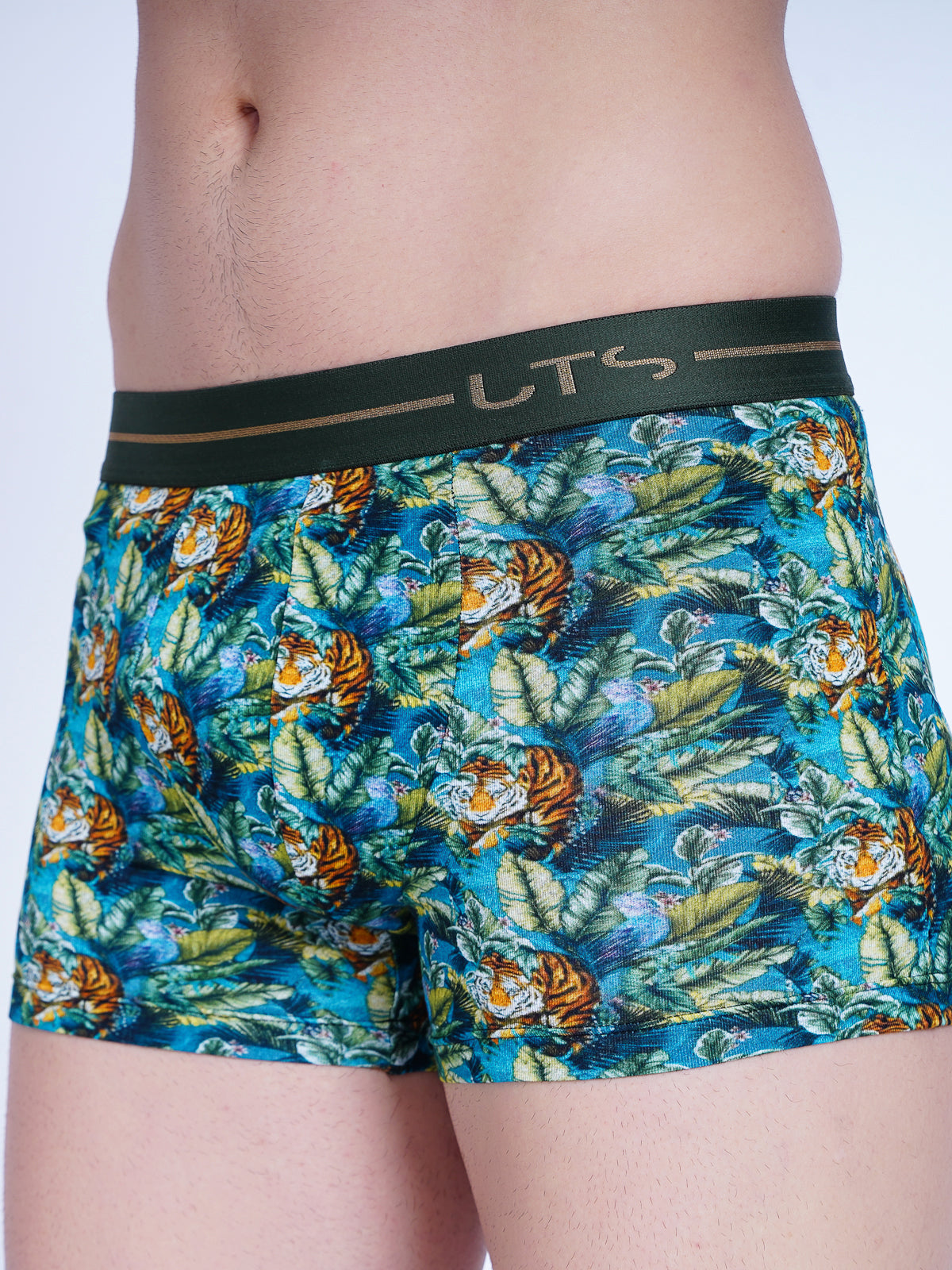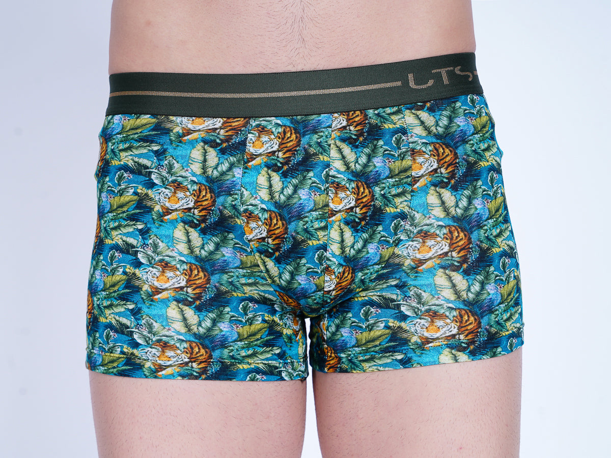 Unleash your wild side with a Savage Roar. A fiercely unique jungle print that roars with untamed energy. Immerse yourself in the vivid imagery of a jungle adorned with majestic tigers, embodying strength and primal allure. Crafted for the bold and adventurous, these boxer trunks are more than just style-they capture the spirit of the untamed. Let the savage roar be your choice for making a bold statement.